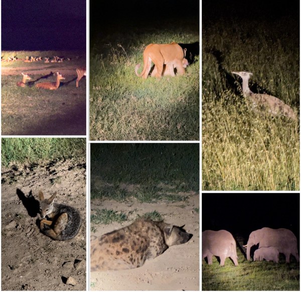As night fell, we decided to take a night drive. It wasnt as great as I expected but what we saw were these same animals with different behavior. During the day, the lions sleep a lot. Tonight, a lone lioness was spotted surveying her territory from a distant hill, while watching a playful trio of lions wrestling amongst themselves. We saw several hyena’s and babies catching some shut-eye on the side of the road and a majestic Kori Bustard strutting its stuff. Each encounter felt special. We woke up a black-backed jackal napping in the moonlight and followed an elephant family, all adding to this nocturnal landscape.