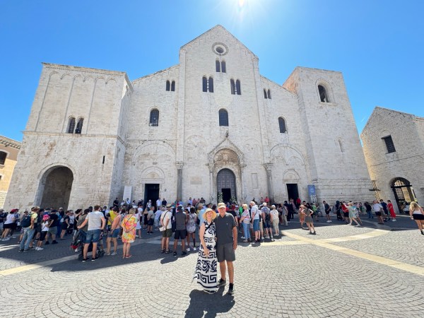 Our first stop was the imposing Basilica di San Nicola, a UNESCO World Heritage Site. This roman architecture houses the revered remains of Saint Nicholas, better known to us as Santa Claus! Opening the heavy oak doors was quite a feat, but after we were in, we were met with a scene straight out of a fairytale. A wedding ceremony was in full swing! The bride had just arrived by car and the groom was in his place at the alter. So romantic to have your wedding in Italy. The air buzzed with a joyful energy, the scent of flowers mingling with the old wood and marble. We stood mesmerized for a moment, captivated by the beauty of the bride, in a flowing white gown, and the groom beaming with pride. Silently offering our congratulations, we tiptoed further in, careful not to disrupt the ceremony. The soft glow of stained-glass windows cast a light on the ornate interior, making the experience even more unforgettable.