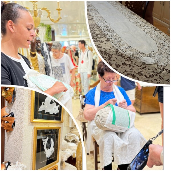We explored a lace factory/store, marveling at the intricate patterns created by nimble fingers working on delicate threads. One small 2 x 3 piece can take up to 3 hours to make. The history and dedication behind this craft were inspiring. I think I’ll stick to my crocheting for now.