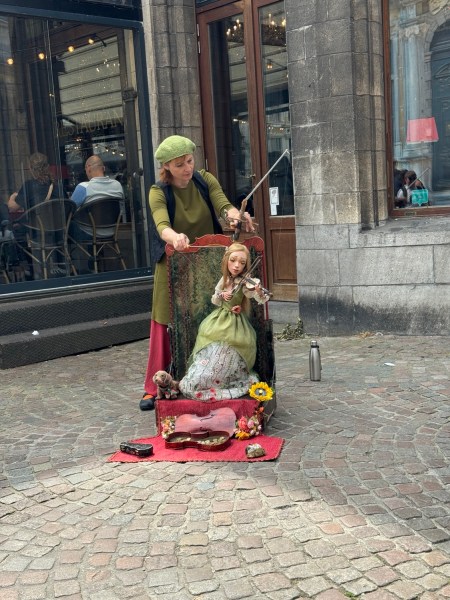As we strolled through the city, we were drawn to a woman handling a musical marionette playing a violin. Several puppeteers were around and brought these charming characters to life, their movements synchronized with the music. This delightful tradition has been a part of Bruges for centuries, adding a touch of whimsy to the city’s charm.