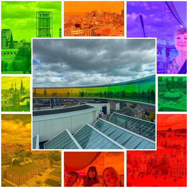 Since we decided on different types of museums today, our next stop was the iconic ARoS Aarhus Art Museum. The “Your rainbow panorama” offered a kaleidoscope of colors that seemed to change with every step. It was an area at the very top of the modern work glass that changed with every few steps we made. Looking outside it changed the color of the world.