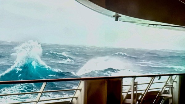 Today was quite the adventure that was totally unexpected! Although our captain has always warned us about a rocking ship, I’m not sure he expected this so quickly. As our world cruise was about 24 hours from arriving in to Iceland, our journey turned out to be anything but smooth sailing. We watched the waves start building and soon we were met with hurricane force winds and 25-foot waves. Of course we didn’t know that until the captain came into our cabins over the intercom system, which is rare.