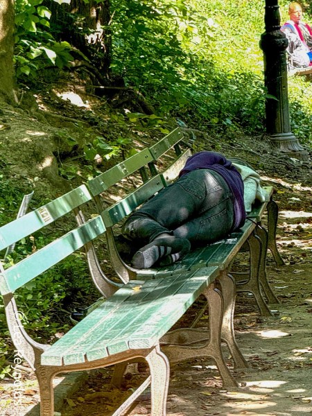 We enjoyed a leisurely walk and found a peaceful spot to relax in some benches overlooking the pond with its giant skyscrapers in the background. Of course we had to share the benches with those using them for naps or beds.