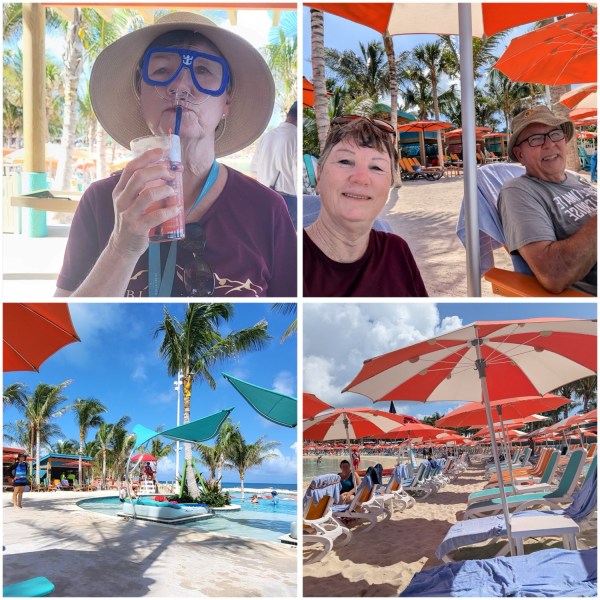 We took our time and had a leisurely breakfast. The nice part was we had friends save us a lounge chair on the island! We didn’t use ours much though. Way too hot. Another friend had saved some chairs in the shade so we jumped at the opportunity to borrow theirs for a while. We are just not sun worshippers. The entire trip I only wore my swimsuit once and that was at the Blue Lagoon in Iceland. Chuck enjoyed a couple of times in the ships hot tub trying to appease his hip to no avail.