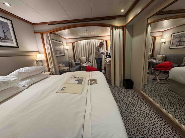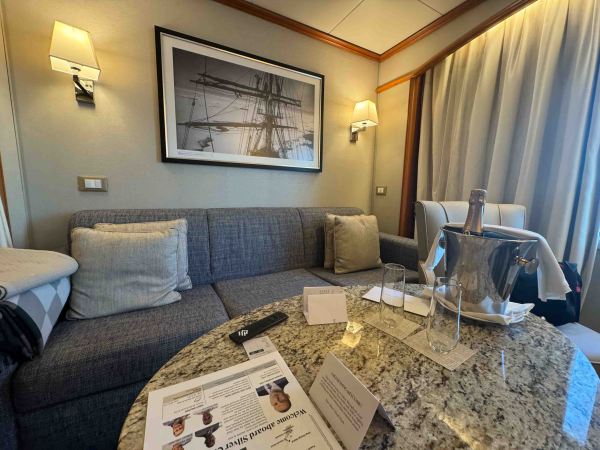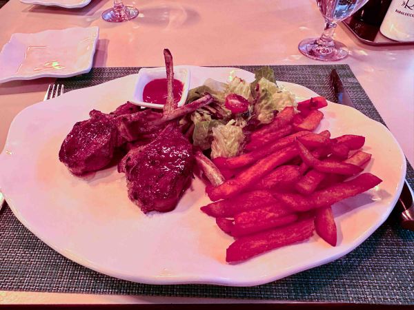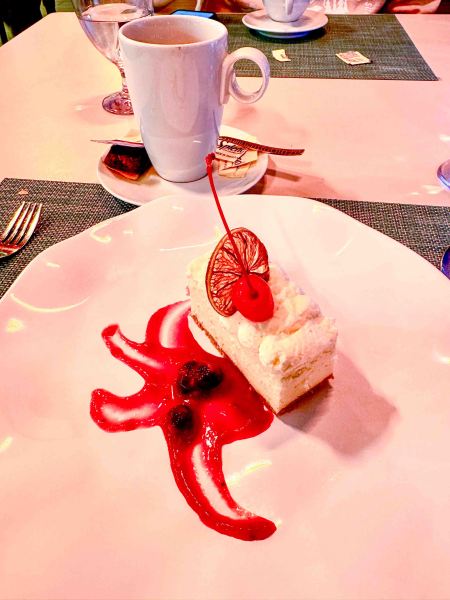 And then… dinner magic happened. We’re sitting in the restaurant enjoying a truly excellent steak when someone yells “WHALES!” We counted at least twelve Sei whales feeding right off the ship—lots of flukes and water spray during their show. We didn’t experience any breaches yet. I was too polite (and too busy stuffing my face) to run for the camera. That politeness ends tomorrow. Camera stays on the dinner table from now on.