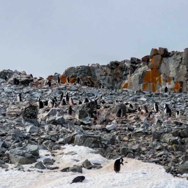 Me? I was on a mission. I wanted to see the baby penguin chicks something fierce, so I pushed on, one careful step at a time. When I finally crested the rocky ridge, oh my—the view opened up like a postcard from heaven. Sparkling blue water, snow-covered hills, and total peace. I had to stop every few minutes to let penguins cross their “highway” (they’ve got right of way). The only downside? Penguins poop constantly, so the “white” snow looked more like a well-used parking lot. Glamorous it is not!