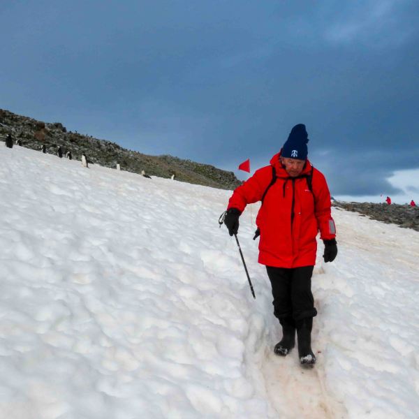 Half Moon Island gave us our grand finale landing, and it didn’t go easy on us. We had a treacherous climb over rocks, ice, and snow—think stair-stepping in ski boots on a slippery hillside. At one point Chuck took a good look at the path, turned to me, and said, “I love you, but I’m not risking this old hip for fluffy chicks.” Smart man—he headed back to the zodiac to wait for me.