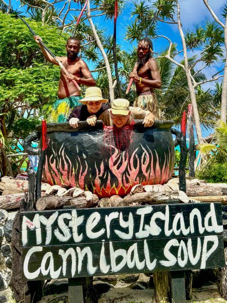 Before we got to the beach, we had to fulfill a family tradition. Back in 2017, we took a hilariously cheesy photo with two locals dressed as cannibals, posing over a giant cooking pot with us as the “daily special.” Naturally, we had to recreate the magic today.
